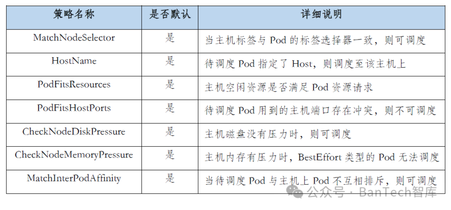 预选策略是预选阶段的核心功能,通过组合多个预选策略可以完成一条可扩展的过滤器链,目前Kubernetes常用的预选策略见表1。