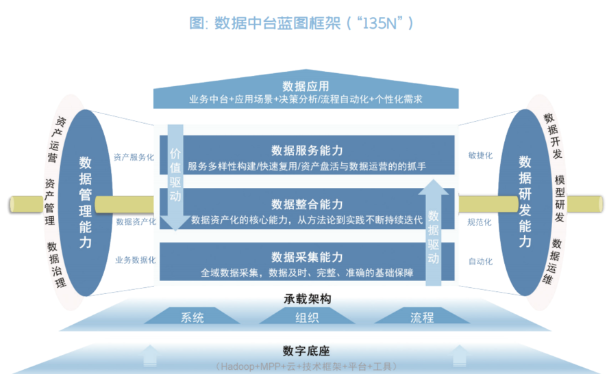 数据中台整体设计以数据能力建设为抓手,构建“135N”数据中台蓝图框架。基于统一的数字底座,通过系统、组织、流程三大架构承载,架设数据中台五大数据能力建设的可持续发展快车道,赋能数字化转型。