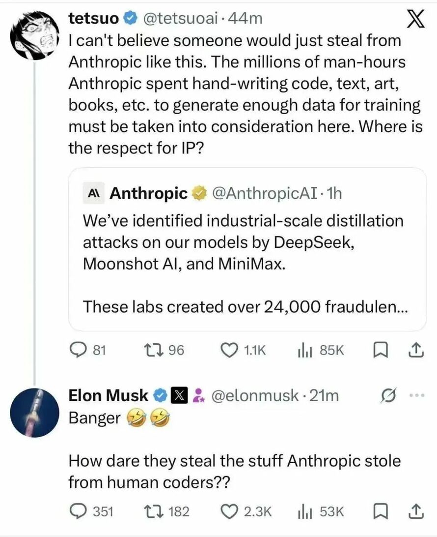 针对此事,马斯克在X平台转发调侃,火力全开:“他们竟敢‘偷窃’Anthropic从人类程序员那儿‘顺’走的东西?”