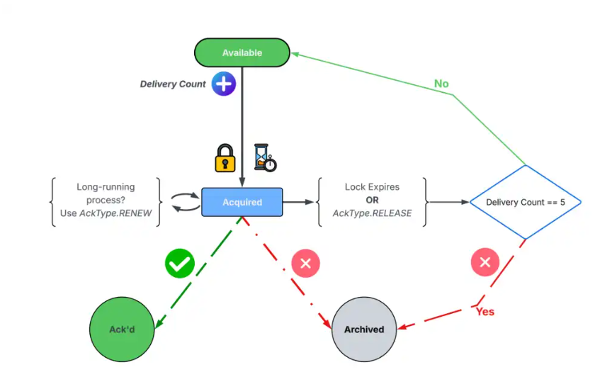 一旦消息预计将在有限时间内被处理。如果这个“锁定”或“租约”到期,消息要么返回该状态(以便重试),要么根据消息的投递次数限制被移入该状态(不再重试)。每个消息的状态和投递次数都会在共享分区中被跟踪。这为开发者提供了内置的重试机制,如果消息处理进程需要重试,可以通过类型进行确认。