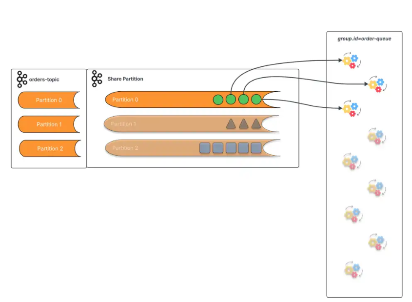 共享组引入了一种新的协作消费模式,组内的消费者工作方式类似于消息队列系统中的消费者/订阅者。在 Broker 端,每个主题分区都有对应的共享分区,用于跟踪每条消息相对于共享组的生命周期。这使得共享消费者的规模可以突破主题分区数量的限制。
