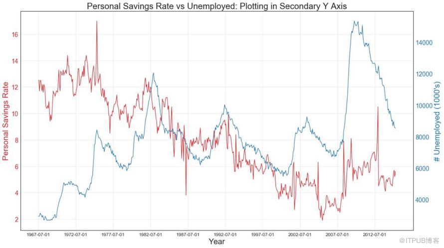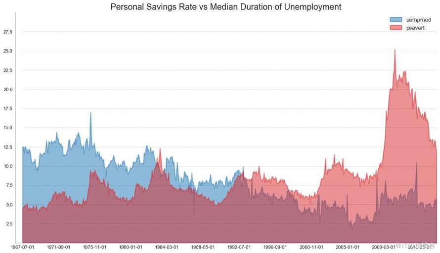 未堆积面积图用于可视化两个或更多个系列相对于彼此的进度(起伏)。 在下面的图表中,您可以清楚地看到随着失业中位数持续时间的增加,个人储蓄率会下降。 未堆积面积图表很好地展示了这种现象。
