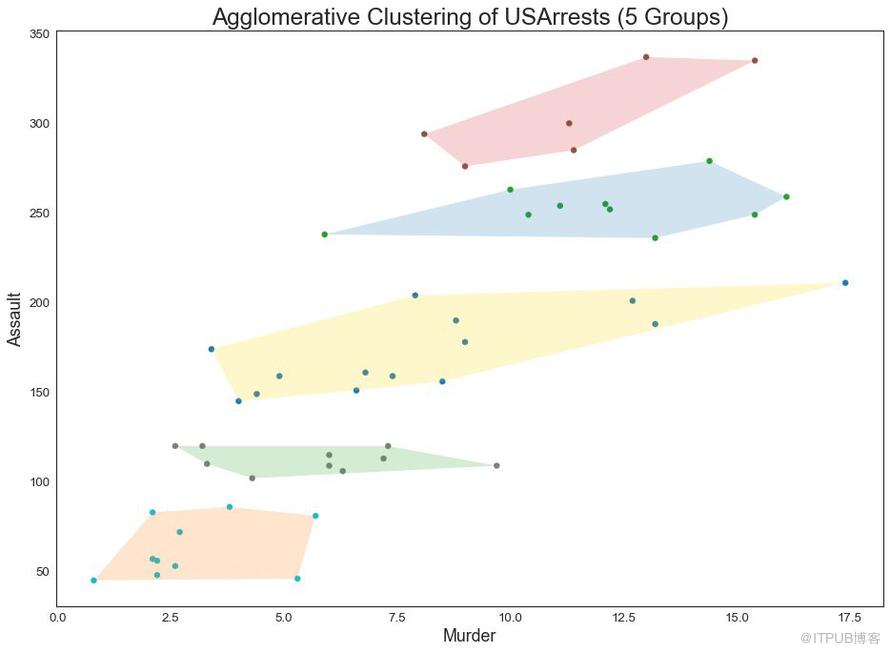 簇状图 (Cluster Plot)可用于划分属于同一群集的点。 下面是根据USArrests数据集将美国各州分为5组的代表性示例。 此图使用“谋杀”和“攻击”列作为X和Y轴。 或者,您可以将第一个到主要组件用作X轴和Y轴。