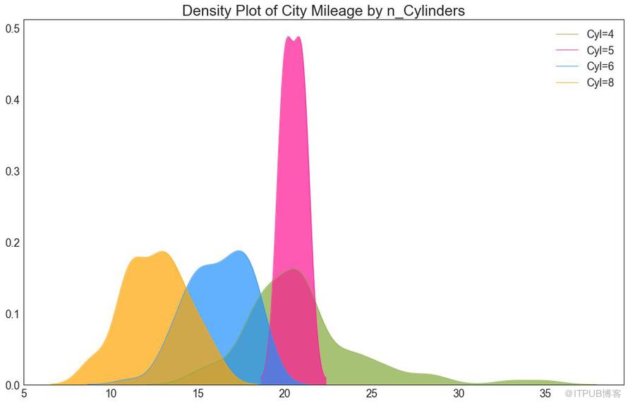 安德鲁斯曲线有助于可视化是否存在基于给定分组的数字特征的固有分组。 如果要素(数据集中的列)无法区分组(cyl),那么这些线将不会很好地隔离,如下所示。