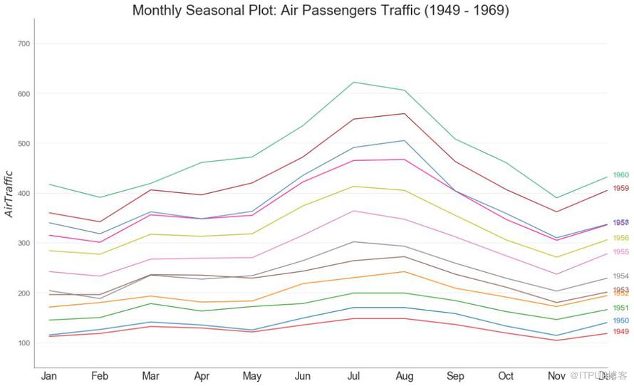季节图可用于比较上一季中同一天(年/月/周等)的时间序列。