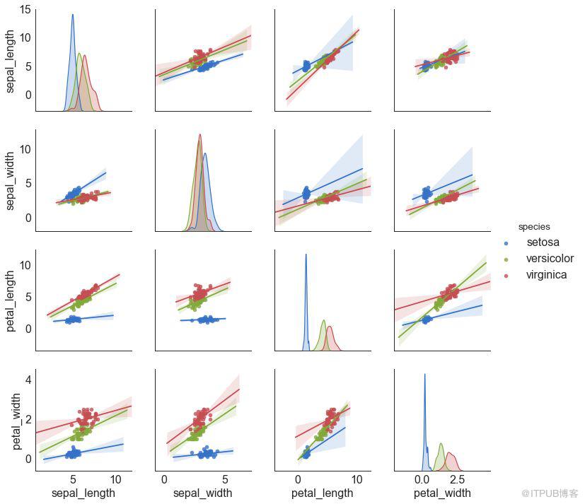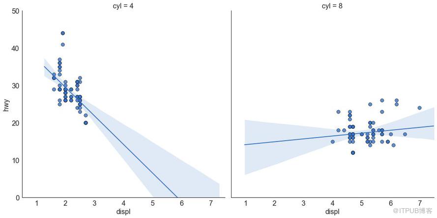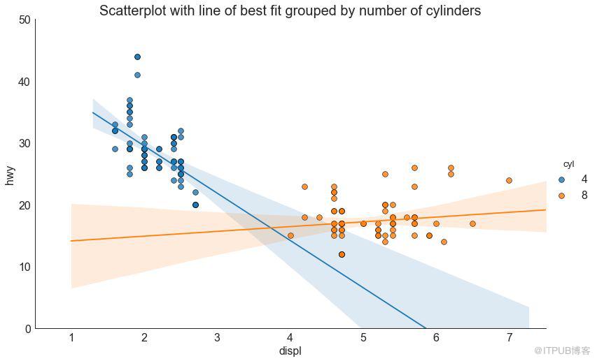 如果你想了解两个变量如何相互改变,那么最佳拟合线就是常用的方法。 下图显示了数据中各组之间最佳拟合线的差异。 要禁用分组并仅为整个数据集绘制一条最佳拟合线,请从下面的 sns.lmplot()
