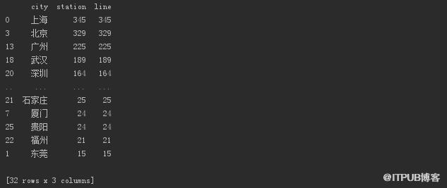 通过城市及地铁线路进行分组,得到全国地铁线路总数。