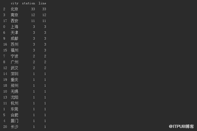 df2 = df1.groupby(['city']).count().reset_index().sort_values(by='line', ascending=False)
