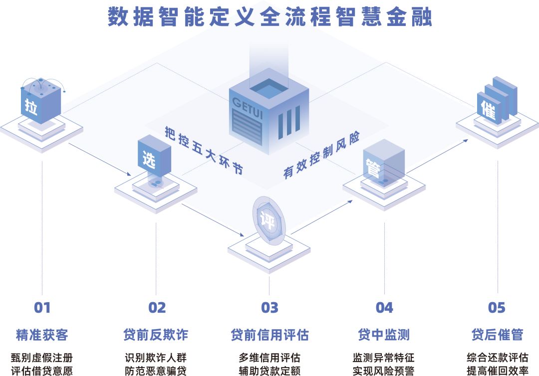 利用上述多维度特征和建模能力,增能于贷前、贷中和贷后全流程:拉、选、评、管、催五大环节。