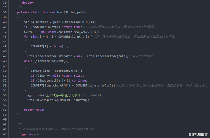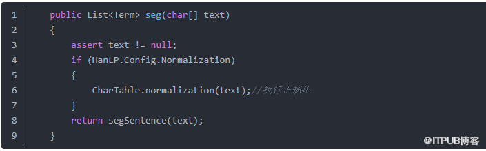 下面来看下CharTable.normalization(text);这个函数的实现:这个函数极其简单,就是对text中的每个字符查询一维数据COVERT,看到这里应该就能明白,正规化最重要的就是加载txt文件到CONVERT数组中