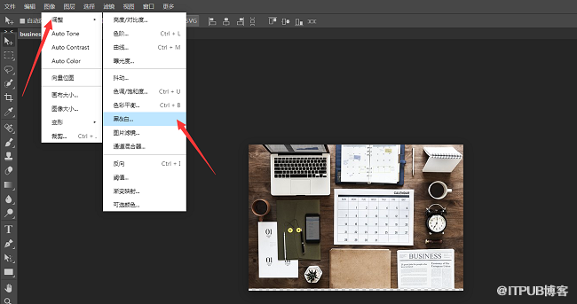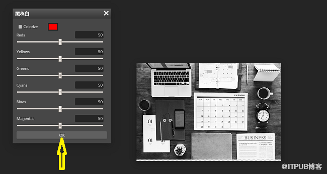 4 、打开图片之后,点击上方工具栏的“图像——调整”在调整的下拉菜单中点击“黑&白”,会出现一个颜色调整框,点击“OK”,图片就会变成黑白的了;
