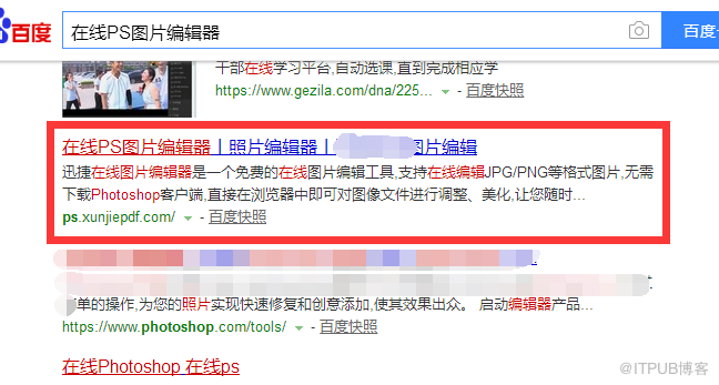 1 、首先现在的在线PS网站很多,选择一个比较好用的十分重要,小编以最喜欢的一个为例。在百度搜索“在线PS图片编辑器”,找到同样的在线网站,点击进入;