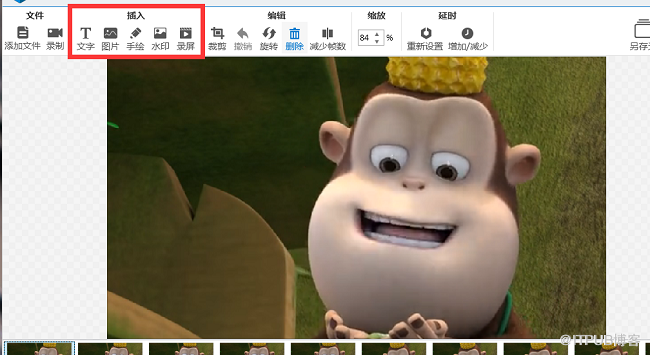 4 、上方一栏都是其功能,根据制作的GIF的需要对其进行编辑,常用的文字工具,水印,还有手绘;