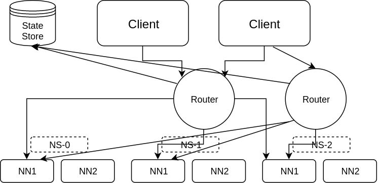 在社区文档中提到的推荐实践是,在每一个 NameNode 的机器上启动一个 Router 服务,State Store 是 Zookeeper 实现,挂载表的映射关系中 Federation Namespace 和子集群 Namespace 上的路径相同。