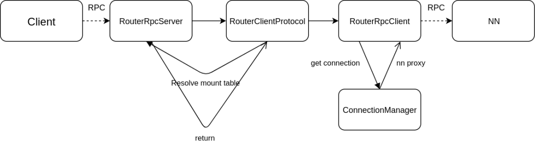 Router 在通过 RouterRpcServe 收到 RPC 后,显示通过解析挂载表得到对应的子集群和其路径,再通过 ConnectionManager 构造出对应NameNode 的 RPC Client,利用 Client 转发这个 RPC.