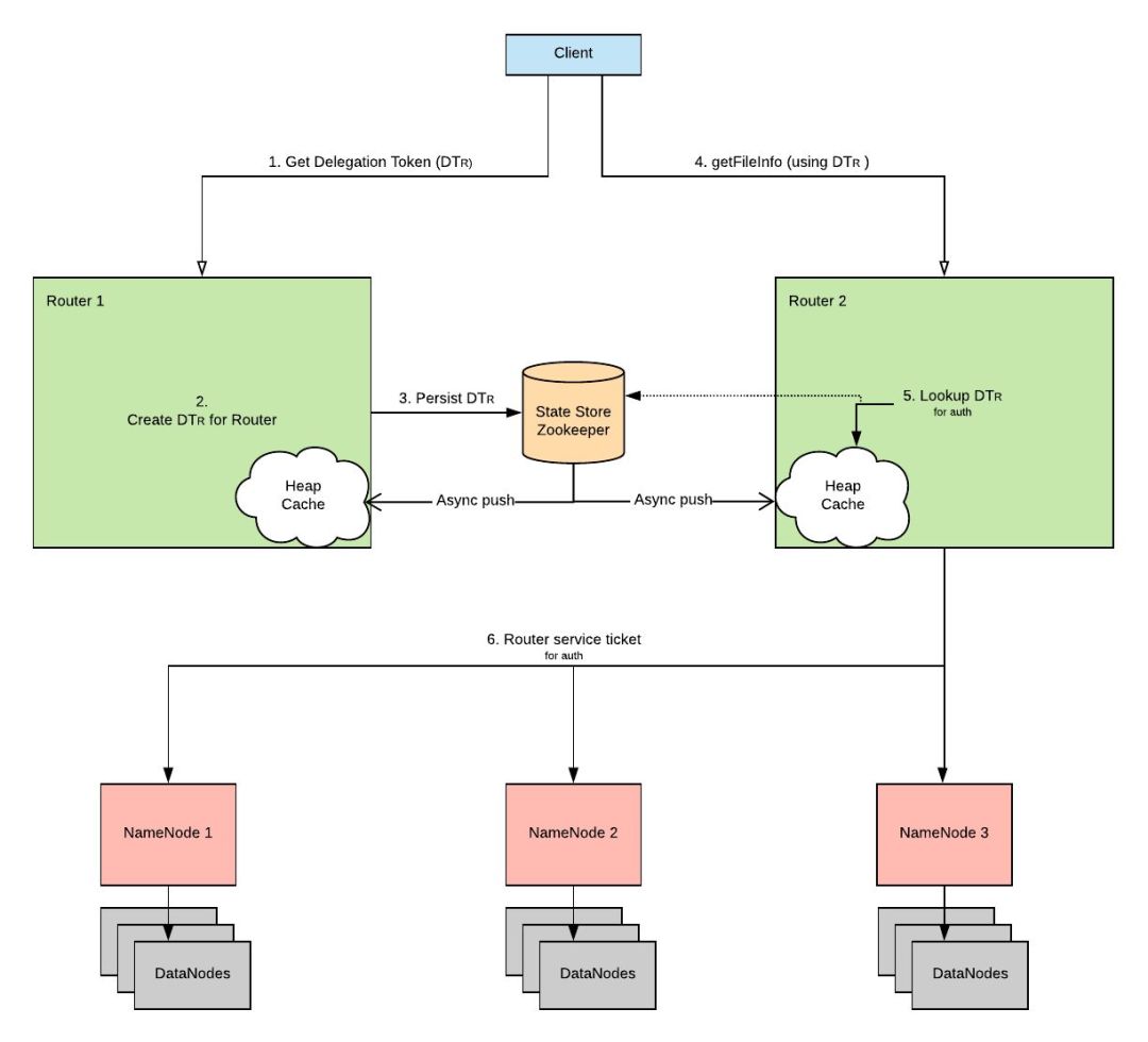 按照社区现在的实现,是由 Router 来构造 Delegation Token,认证Client.为了让所有的 Router 能同步已构造的 Delegation Token,需要将其存到 State Store 来让 Router 间进行同步。这样做的好处实现简单,不需要和所有的 NameNode 进行通信就可以在 Route r层完成认证。坏处是需要 Router 间进行同步,这可能会导致性能问题,以及由于 Zookeeper 并非保证强一致性,Router 可能会读不到另一个 Router构造的 Delegation Token,结果 Client 认证失败。