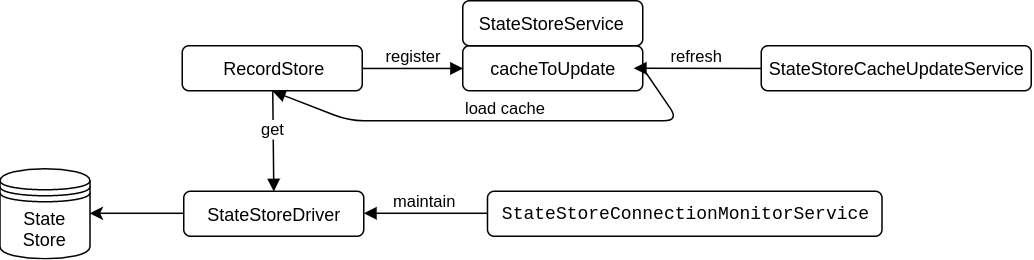 负责与 State Store 通信的是 StateStoreDriver,定义了一些基本的GET/PUT 接口,由 StateStoreConnectionMonitorService 维护。StateStoreService 是 Router 管理 State Store 的服务,负责从 State Store 拉取数据,更新注册进来的 RecordStore 的缓存。在 State Store 上存储的叫做Record,目前只有基于 protobuf 的序列化实现。