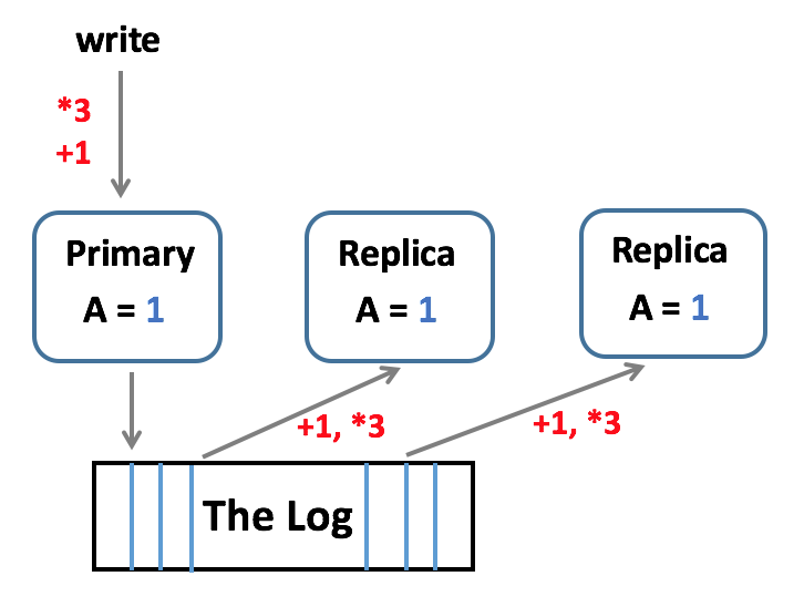 如图,Primary 依次进行 "+1"、"*3" 的操作,并写入日志,利用日志做修改操作的“数据分发”,使得各副本能够在本地应用完全相同的操作序列,从而保证各副本数据的一致;
