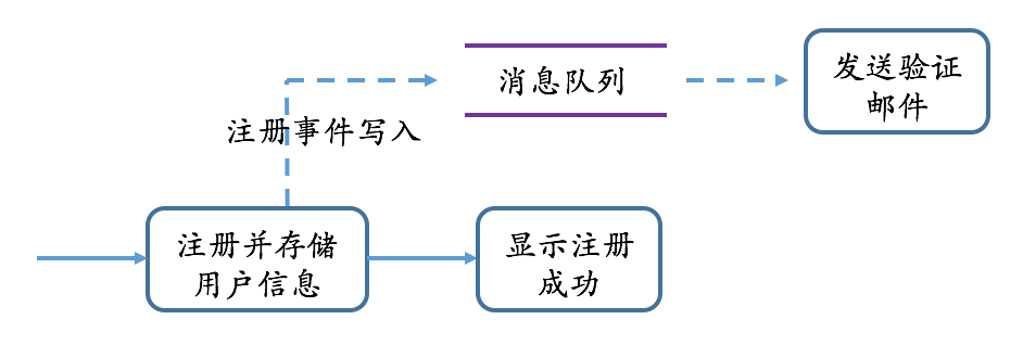 对于注册流程来说,系统不需要等待发送邮件成功才告知用户注册成功,即发送邮件是否成功这个结果在注册的时间点并不是必须要拿到的,注册逻辑只需要“通知”下游产生了一个注册事件即可;