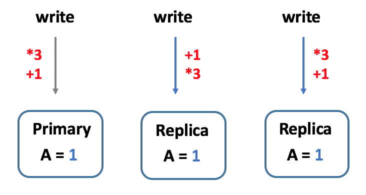 假设系统有三个副本,都存储着 A=1 的初始值,某一时刻,要执行一个加法乘法的操作序列对 A 的值进行修改:"+1"、"*3"