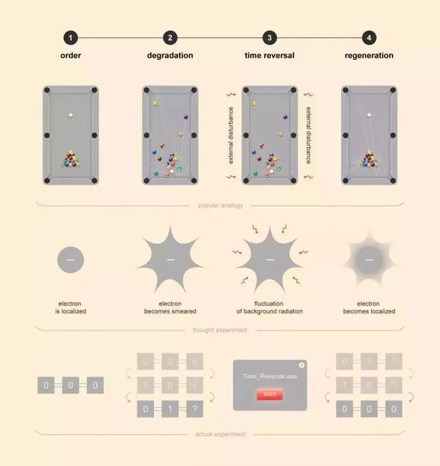 阶段3:时间逆转。这时,通过一个设计精确的特殊程序,量子计算机就可以诱导时间“向后”逆转,从混沌走向有序。就像出现一位大神,给台球桌施加了完美计算的一记踢脚。