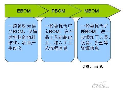 在产品的整个生命周期中,主要存在3种不同形式的BOM:设计类物料清单(EBOM)﹑工艺类物料清单(PBOM)和制造类物料清单(MBOM):