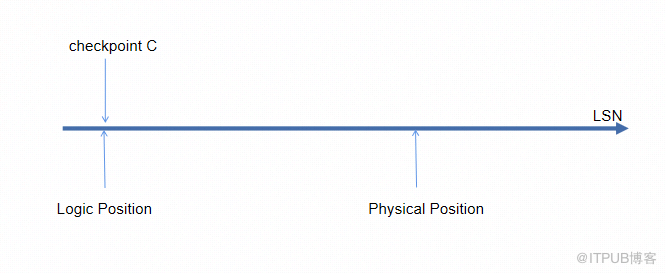 那么,这个点的位置是检查点发生时的LSN还是检查点结束后的LSN?答案是检查点发生时的LSN.这个LSN又称为逻辑位置,checkpoint实际写入