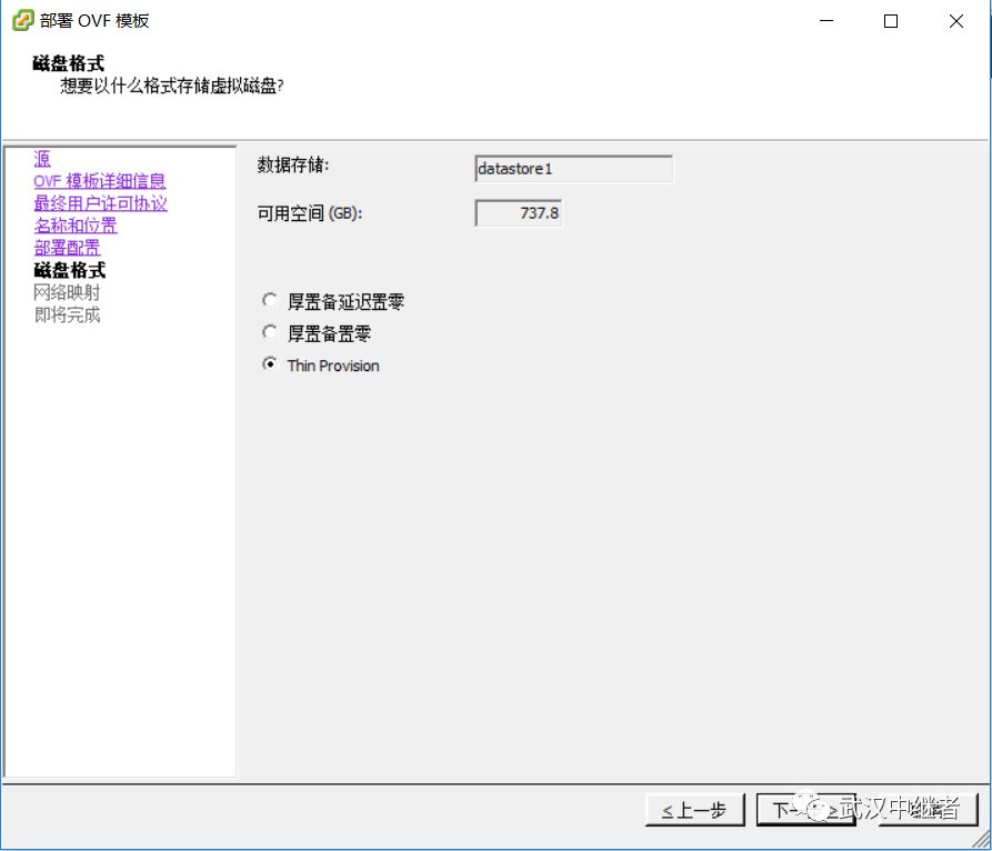 在OVF模板部署向导中,配置ASAv在ESXi中的存储方式,并下一步: