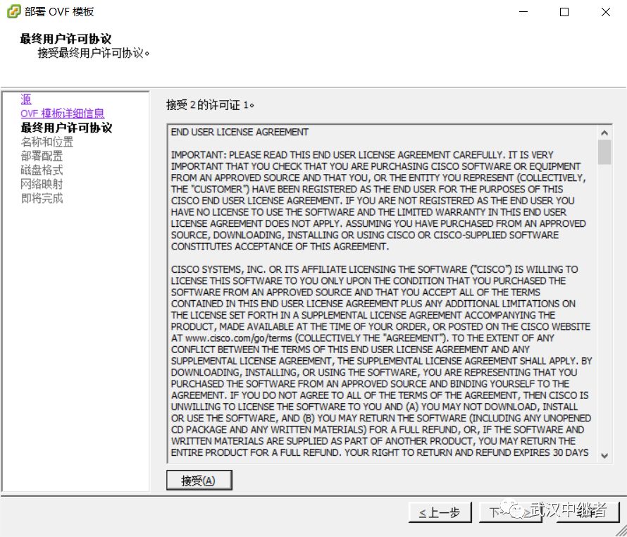 在OVF模板部署向导中,接受用户协议,并下一步: