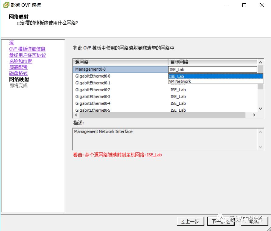 在OVF模板部署向导中,配置ASAv的网卡,并下一步,ASAv默认提供了8个业务接口和一个管理接口: