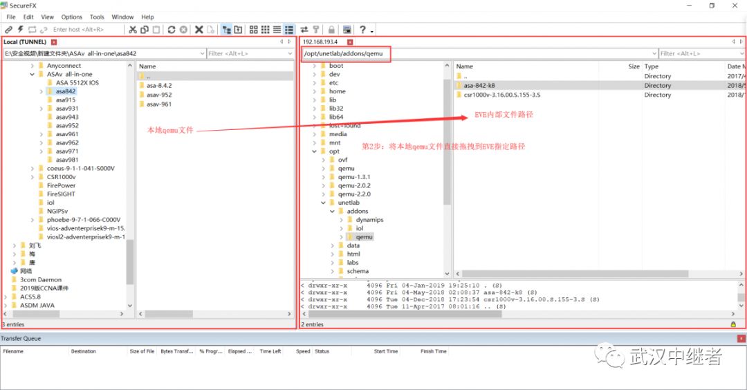 将本地ASA的quem文件夹上传到EVE的/opt/unetlab/addons/qemu目录下,同时注意ASA的文件名,ASA的文件必须以“asa-”为前缀,例如,asa-8.4,文件夹里面的镜像文件必须以“hda”为前缀,例如,hda.qcow2;