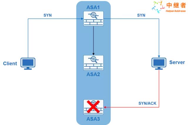 • Server收到SYN消息,回复SYN/ACk消息(第二次握手),但是由于网络负载均衡的原因,流量未沿着原路ASA1返回,却发送到了ASA3,可ASA3无关于Client访问Server的状态化记录,所以SYN/ACK消息在ASA3上将被丢弃。TCP连接建立不成功