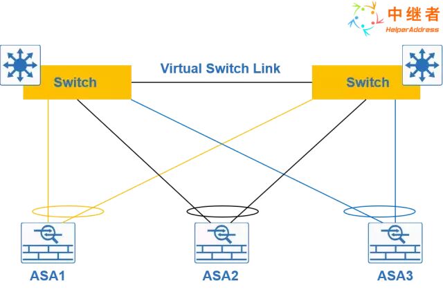 两台物理交换机使用VSS技术虚拟成为一台逻辑交换机,ASA1,ASA2,ASA3链路使用Ether Channel方式与逻辑交换机互联.