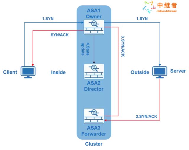 如图4所示,ASA1-ASA3部署一个Cluster对外提供服务,Client和Server间需要建立一个TCP连接,三次握手建连接。