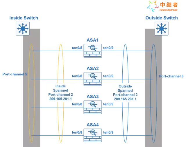 如图1所示,ASA1-ASA4组成一个Cluster,为了实现流量负载分摊,各自添加ten0/8到Spanned Port-channel 1中,添加ten0/9到Spanned port-channal 2中,分别与inside交换机和outside交换机互联,Ether Channel为