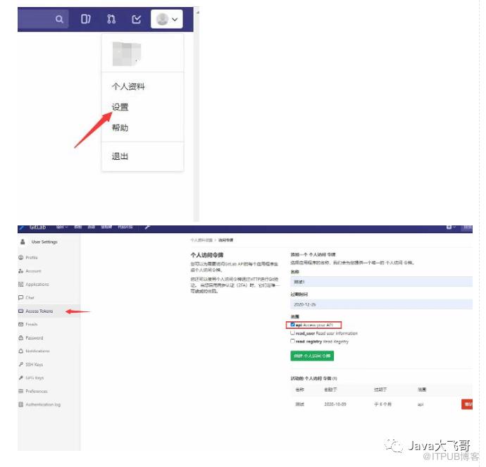登录 GitLab,选择 设置 - Access Tokens,创建个人访问令牌