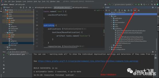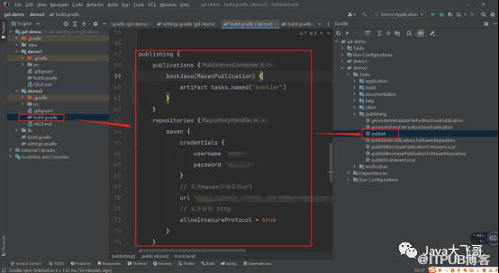 plugins {id 'org.springframework.boot' version '2.7.4'id 'io.spring.dependency-management' version '1.0.14.RELEASE'id 'java'id 'maven-publish'}group = 'com.example'version = '0.0.1-SNAPSHOT'sourceCompatibility = '1.8'repositories {// mavenCentral()}dependencies {/* implementation 'org.springframework.boot:spring-boot-starter'testImplementation 'org.springframework.boot:spring-boot-starter-test'*/}// 打jar包的配置/*jar {manifest {attributes "Manifest-Version": 1.0, 'Main-Class': 'com.example.demo1.Demo1Application'}}*/publishing {publications {bootJava(MavenPublication) {artifact tasks.named("bootJar")}}repositories {maven {credentials {username 'xxxx'password 'xxxxx'}// 发布maven存储库的urlurl "http://xxxxx:xxxxx/repository/maven-snapshots/"// 允许使用 httpallowInsecureProtocol = true}}}tasks.named('test') {useJUnitPlatform()}