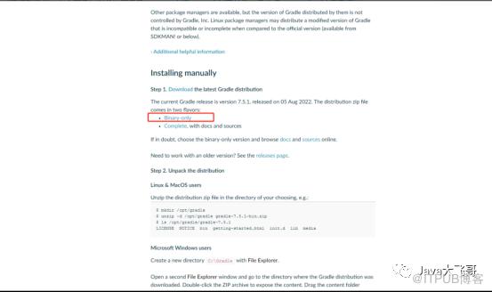 官方网站:https://gradle.org/install/#manually提供了两种下载方式,Binary-only是只下载二进制源码,Complete, with docs and sources是下载源码和文档,这里下载Binary-only,不然安装配置之后,在idea配置完成,idea中的Terminal中执行gradle相关的指令就会报错的,使用Binary-only安装配置的则不会有这个问题。