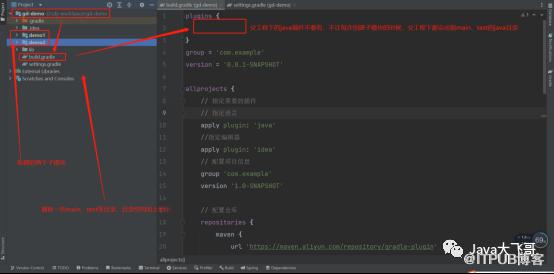 plugins {}group = 'com.example'version = '0.0.1-SNAPSHOT'allprojects {// 指定需要的插件// 指定语言apply plugin: 'java'//指定编辑器apply plugin: 'idea'// 配置项目信息group 'com.example'version '1.0-SNAPSHOT'// 配置仓库repositories {maven {url 'https://maven.aliyun.com/repository/gradle-plugin'}maven {url "https://maven.aliyun.com/nexus/content/groups/public/"}maven {allowInsecureProtocol = trueurl 'http://xxxxx:xxxx/repository/maven-snapshots/'}mavenCentral()gradlePluginPortal()jcenter()//mavenLocal()}}// 配置子工程subprojects {// 指定编译版本sourceCompatibility = 1.8targetCompatibility = 1.8// 配置字符编码tasks.withType(JavaCompile) {options.encoding = 'UTF-8'}// 配置全局依赖版本信息ext {junitVersion = '4.12'}//配置子模块依赖dependencies {implementation 'org.springframework.boot:spring-boot-starter-web'compileOnly 'org.projectlombok:lombok'implementation 'org.springframework.boot:spring-boot-starter'testImplementation 'org.springframework.boot:spring-boot-starter-test'// testCompile group: 'junit', name: 'junit', version:"${junitVersion}"}}