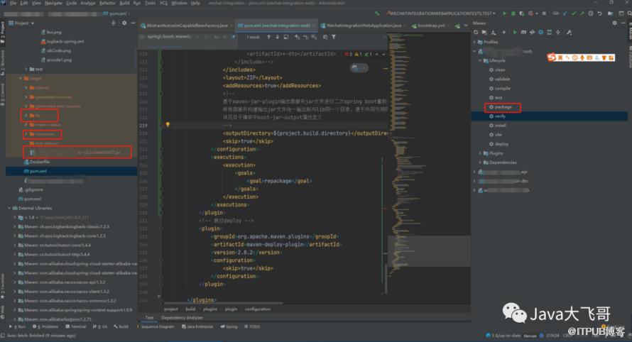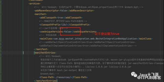 build><plugins><plugin><groupId>org.apache.maven.pluginsgroupId><artifactId>maven-jar-pluginartifactId><configuration><excludes><exclude>static/**exclude><exclude>*.propertiesexclude><exclude>*.xmlexclude><exclude>*.jsonexclude><exclude>*.yamlexclude><exclude>*.ymlexclude><exclude>*.pngexclude><exclude>*.txtexclude>excludes><archive><addMavenDescriptor>falseaddMavenDescriptor><manifest><addClasspath>trueaddClasspath><classpathPrefix>lib/classpathPrefix><useUniqueVersions>falseuseUniqueVersions><mainClass>com.dyyy.wechat.integration.web.WechatIntegrationWebApplicationmainClass>manifest><manifestEntries><Class-Path>./resources/Class-Path>manifestEntries>archive><outputDirectory>${project.build.directory}outputDirectory>configuration>plugin><plugin><groupId>org.apache.maven.pluginsgroupId><artifactId>maven-dependency-pluginartifactId><executions><execution><id>copy-dependenciesid><phase>packagephase><goals><goal>copy-dependenciesgoal>goals><configuration><outputDirectory>${project.build.directory}/lib/outputDirectory>configuration>execution>executions>plugin><plugin><artifactId>maven-resources-pluginartifactId><executions><execution><id>copy-resourcesid><phase>packagephase><goals><goal>copy-resourcesgoal>goals><configuration><resources><resource><directory>src/main/resourcesdirectory>resource>resources><outputDirectory>${project.build.directory}/resourcesoutputDirectory>configuration>execution>executions>plugin><plugin><groupId>org.springframework.bootgroupId><artifactId>spring-boot-maven-pluginartifactId><configuration><mainClass>xxx.xxx.Starter(项目的主类的全路径名--包名.类名)mainClass><classifier>execclassifier><includeSystemScope>trueincludeSystemScope><includes><include><groupId>nullgroupId><artifactId>nullartifactId>include>includes><layout>ZIPlayout><addResources>trueaddResources><outputDirectory>${project.build.directory}outputDirectory><skip>trueskip>configuration><executions><execution><goals><goal>repackagegoal>goals>execution>executions>plugin><plugin><groupId>org.apache.maven.pluginsgroupId><artifactId>maven-deploy-pluginartifactId><version>2.8.2version><configuration><skip>trueskip>configuration>plugin>plugins>build>