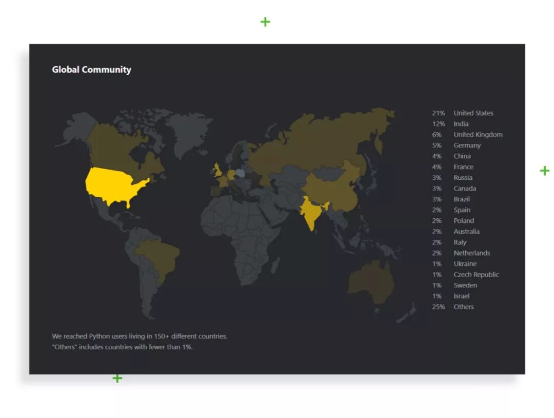高人气的直接影响之一是Python在世界上每个国家都有大量的崇拜者。反过来,这意味着很容易找到项目的开发人员,并且他们不会是唯一且不可替代的。