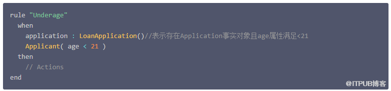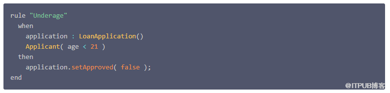规则的“then”部分也称为规则的右侧(RHS)包含在满足规则的条件部分时要执行的操作。如银行要求贷款申请人年满 21 岁(Applicant( age < 21 ))。不满足则拒绝贷款setApproved(false)