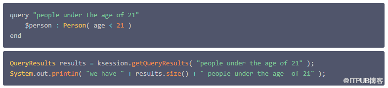 查询名称对于 KIE 库是全局的,因此在项目中的所有其他规则查询中必须是唯一的。返回查询结果ksession.getQueryResults("name"),其中"name"是查询名称。
