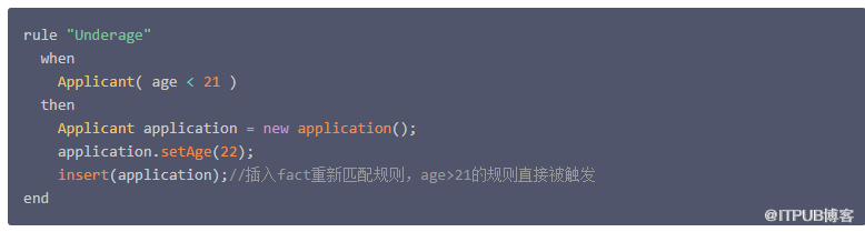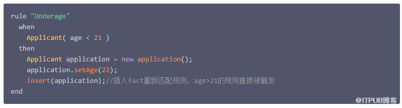 作用:修改工作内存中fact数据,并让相关规则重新匹配