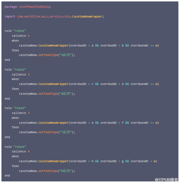 虽然通过编写drl可以解决规则维护的问题,但是让业务人员去编写这样一套规则脚本显然是有难度的,那么在催收系统中是怎么做的呢,我们继续往下看。