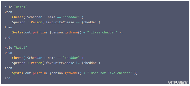 以下是模式共享的案例,两个规则共享第一个模式Cheese( $cheddar : name == "cheddar" )