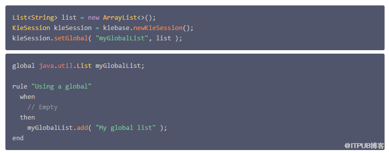 通过 KIE 会话配置在 Drools 引擎的工作内存中设置全局值,在 DRL 文件中的规则上方声明全局变量,然后在规则的操作 ( then) 部分中使用它。