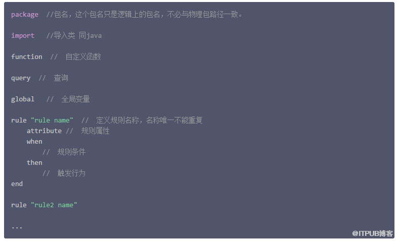 DRL(Drools 规则语言)是在drl文本文件中定义的业务规则。主要包含:package,import,function,global,query,rule end等,同时Drools也支持Excel文件格式。