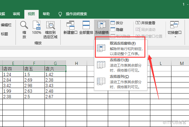 学会如何设置锁定的单元格了,当然也要学会如何取消它。和设置锁定单元格是同样的方式,滑动鼠标左键单击【冻结窗格】。在我们设置锁定的单元格后,再次点击它的之前的冻结窗格就变成了取消冻结窗格了。