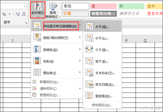 接着点击表格中的【开始】,并且要找到开始中的【条件格式】。在条件格式中,我们需要在多个选择中点击一下【突出显示单元格规则】,之后是【大于】。